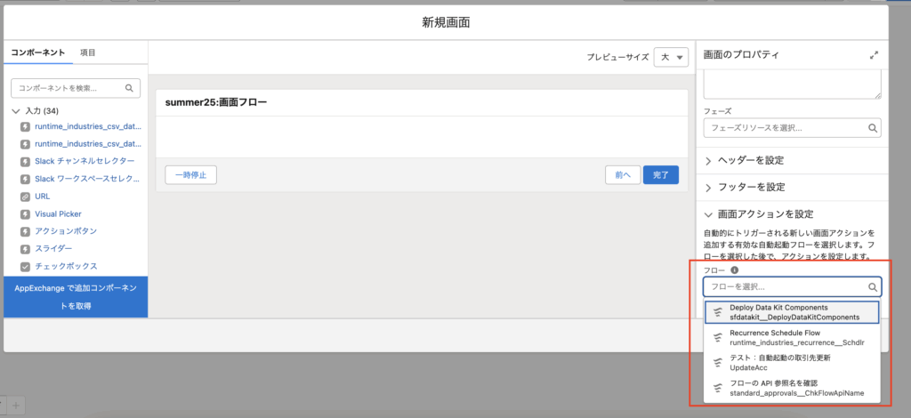 画面フローの画面要素内で「画面アクションを設定」にて使用できます。