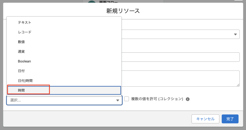オブジェクトマネージャーでカスタム項目作成時は指定できた時間型ですが、