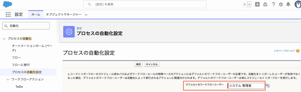 Salesforce自体がフローを実行するため、レコード更新後のレコード最終更新者は[プロセスの自動化設定] – [デフォルトのワークフローユーザー] で設定されているユーザとなります。
