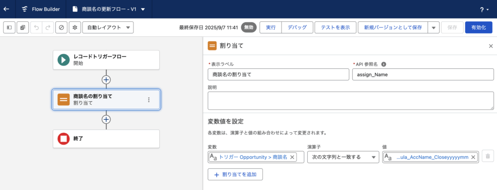 3.商談名の割り当て要素:接続先を「終了」要素から「レコードを更新」要素に変更