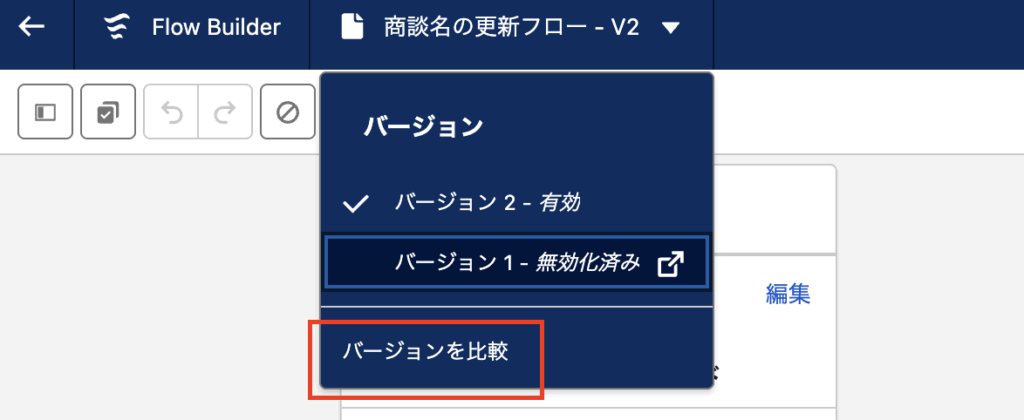 比較したいフローを開き、「バージョンを比較」ボタンを押す