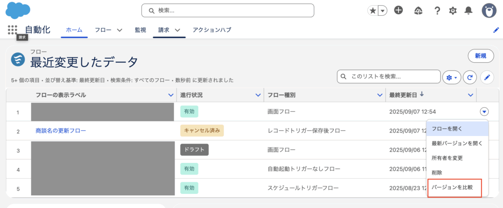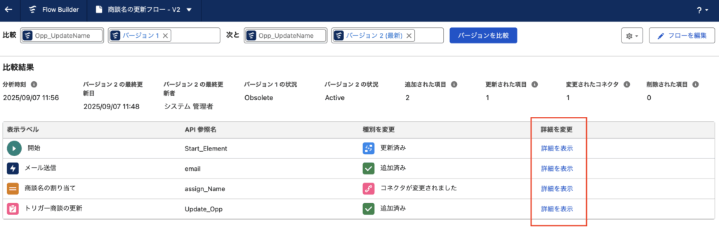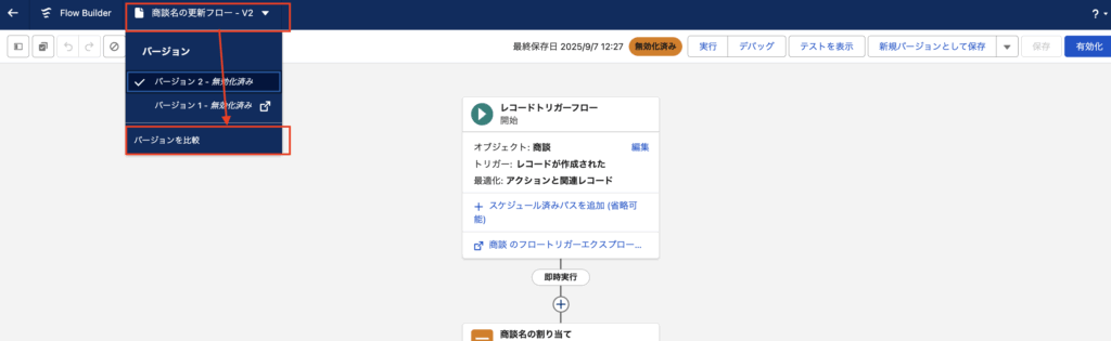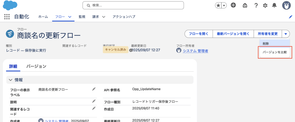 ここではレコードトリガーフローを例に、バージョン比較の手順や内容を確認してみます。
