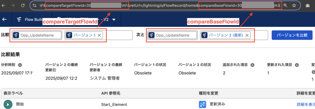 比較画面のSalesforceのURLは下記のように2つのバージョンIDを含んでいます。